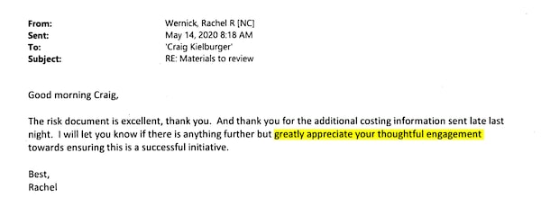 In another email, Michelle Kovacevic thanked departmental colleagues for 'keeping the relationship with WE strong.'