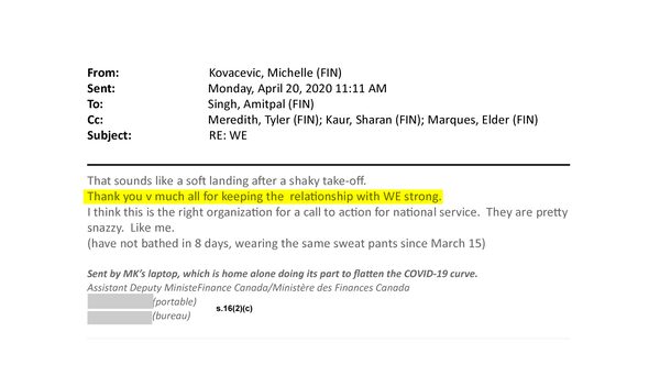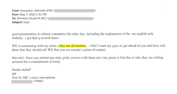 In another e-mail, Michelle Kovacevic, an assistant deputy minister at Finance, thanked departmental colleagues for “keeping the relationship with WE strong. I think this is the right organisation for a call to action for national service. They are pretty snazzy. Like me.” She added in another e-mail to officials that “WE is connecting with my [minister’s office]. They are all besties.”