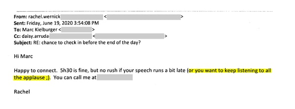 In an email to Marc Kielburger Wernick joked about him being late for a meeting because of a speaking engagement.
