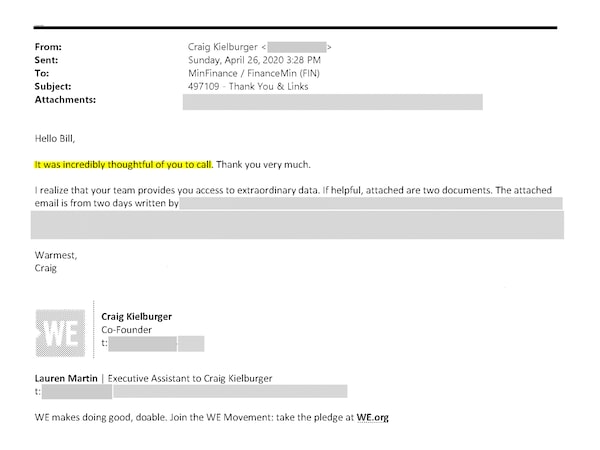 Editor’s note: A previous version of this story said Craig Kielburger thanked Bill Morneau in an e-mail for a phone conversation about a volunteer program; in fact, the e-mail does not make clear that they discussed the program during that call.
