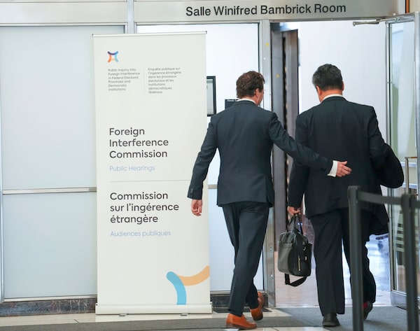 Han Dong, right, walks with lawyer Mark Polley as he arrives to appear as a witness at the Public Inquiry Into Foreign Interference in Federal Electoral Processes and Democratic Institutions in Ottawa on April 2.Sean Kilpatrick/The Canadian Press