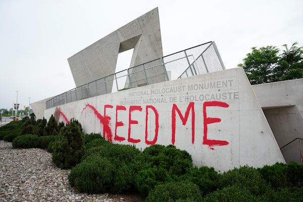 The words 'FEED ME' were painted in red on the National Holocaust Monument in Ottawa on Monday.Sean Kilpatrick/The Canadian Press