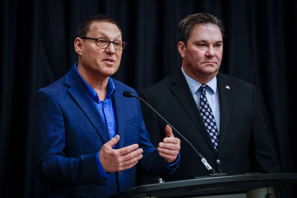 NDP parliamentary leader Don Davies with new leader Avi Lewis in Winnipeg on March 30.JOHN WOODS/The Canadian Press