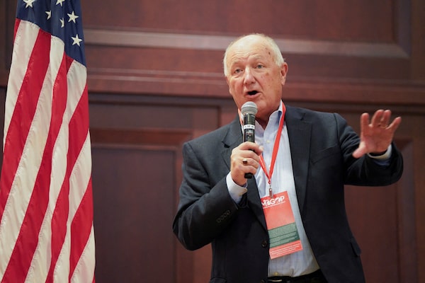 Pete Hoekstra speaks as Michigan Republican Party chair during a Republican caucus in Grand Rapids, Mich., in March, 2024.Dieu-Nalio Chery/Reuters