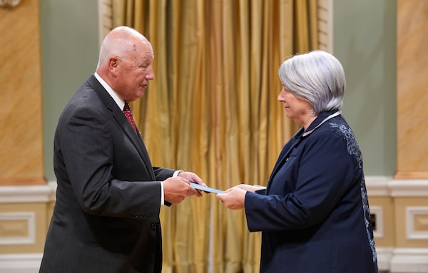 Peter Hoekstra, Ambassador-designate of the United States, left, presents his letters of credence to Governor-General Mary Simon during a ceremony at Rideau Hall in Ottawa on April 29.Adrian Wyld/The Canadian Press