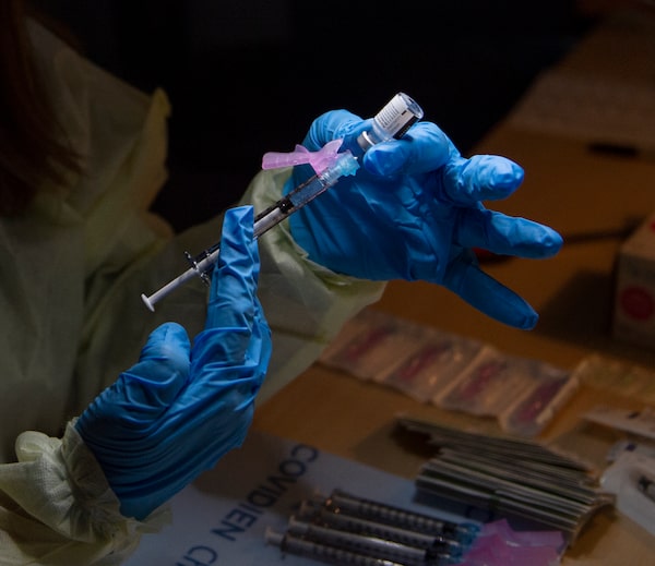 A pharmacy technician draws the Pfizer-BioNTech COVID-19 vaccine from a vial at a University Health Network pilot site in downtown Toronto on Dec. 15, 2020.Fred Lum/The Globe and Mail