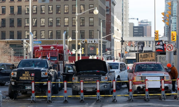 Trucks are blocked by police barricades as a rally against COVID-19 restrictions, which began as a cross-country convoy protesting a federal vaccine mandate for truckers continues in Ottawa on Tuesday, February 1, 2022.PATRICK DOYLE/The Canadian Press