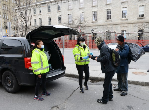 Volunteers of the Odawa Native Friendship Centre's Bannock Bus Outreach program hand out coffee and food to those in need during the COVID-19 pandemic, in downtown Ottawa, on April 16, 2020.Sean Kilpatrick/The Canadian Press