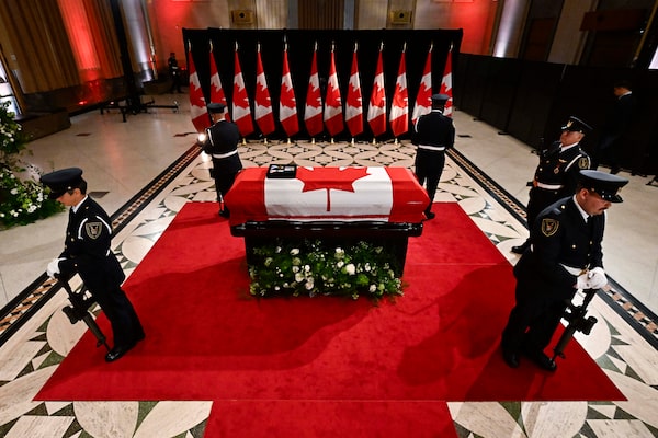 Sentinels surround the casket of former prime minister Brian Mulroney as he lies in state at the Sir John A. Macdonald Building, across from Parliament Hill in Ottawa, on March 19.Justin Tang/The Canadian Press