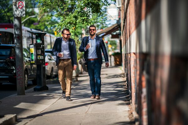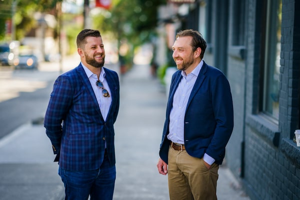 Ontario Proud director Ryan O'Connor, left, walks with founder Jeff Ballingall in Toronto. Mr. Ballingall's company churned out anti-Liberal memes ahead of 2018's provincial election, targeting leader Kathleen Wynne as a 'clown,' 'scumbag' and 'corrupt.'Mark Blinch/The Globe and Mail