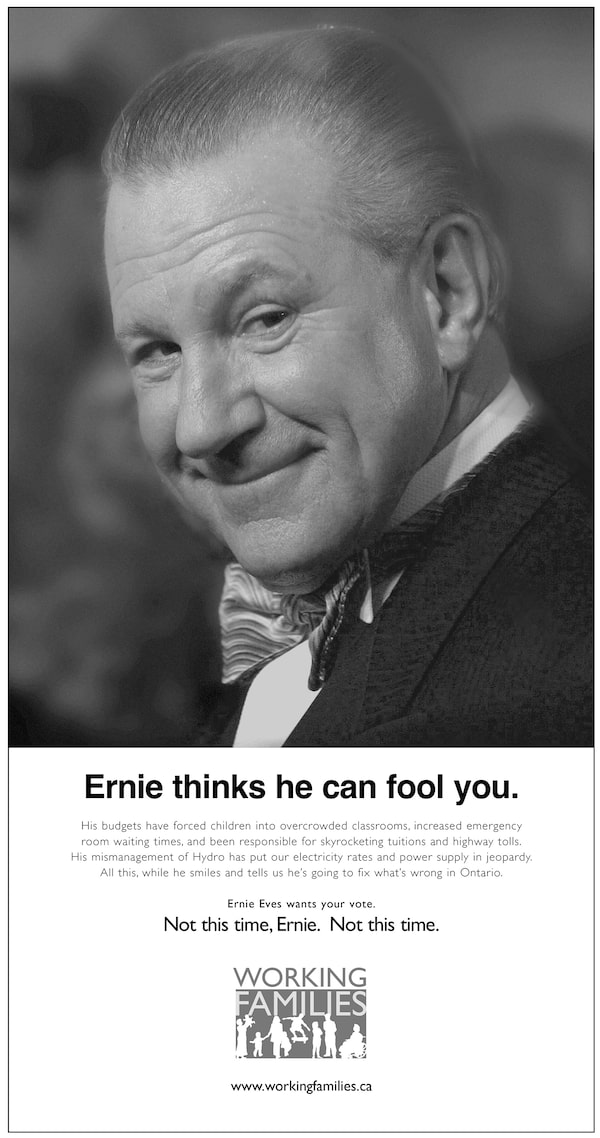 That campaign made its debut on April 1, 2003, about six months before the next provincial election, and targeted Mr. Harris’s successor, then-premier Ernie Eves. Working Families produced a full-page newspaper ad, published in The Globe, prominently displaying a photograph of a smirking Mr. Eves in a tuxedo and bow tie, his hair slicked back. The bold text below the photo read: “Ernie Thinks He Can Fool You,” a play on the date April 1. The ad got a lot of attention, but Working Families was only getting started.