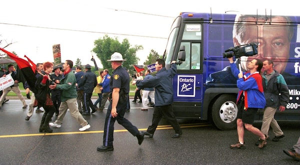 Kingston, 1999: Police try to keep protesters away from Ontario Progressive Conservative leader Mike Harris's campaign bus, which had been leaving a breakfast meeting. Labour movement opposition to Mr. Harris's government helped create Canadian equivalents to the political action committees active in the United States.Jack Chiang/Kingston Whig-Standard/The Canadian Press