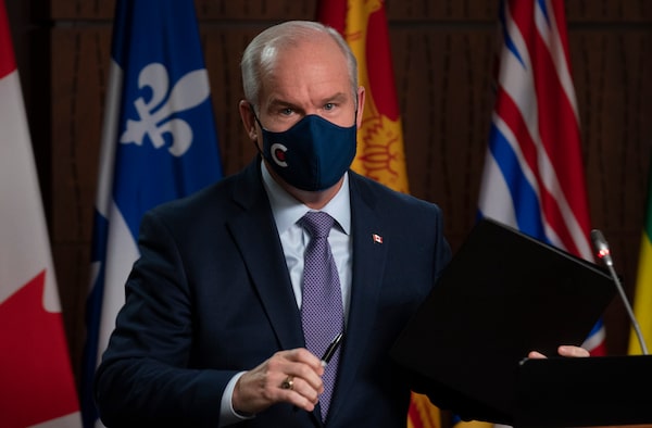 Conservative Leader Erin O'Toole leaves a news conference on Parliament Hill in Ottawa on Oct. 27, 2021.Adrian Wyld/The Canadian Press