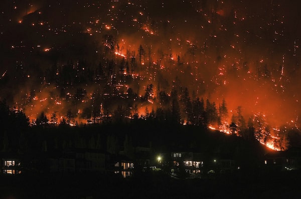 The McDougall Creek wildfire burns on the mountainside above houses in West Kelowna, B.C., on Aug. 18.Darryl Dyck/The Associated Press