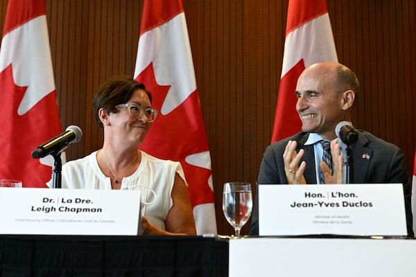Minister of Health Jean-Yves Duclos applauds after announcing Dr. Leigh Chapman as Canada’s Chief Nursing Officer during a news conference in Ottawa, on Aug. 23.Justin Tang/The Canadian Press