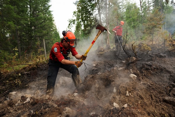 Firefighters with the British Columbia Wildfire Service Titan unit crew work to control the southeastern flank of the Bush Creek wildfire in Turtle Valley in the North Shuswap region of British Columbia on Aug. 23, 2023.JESSE WINTER/Reuters