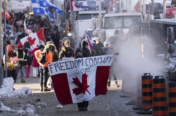 Protesters participating in a cross-country truck convoy protesting measures taken by authorities to curb the spread of COVID-19 and vaccine mandates walk near Parliament Hill in Ottawa, Jan. 29, 2022.Adrian Wyld/The Canadian Press