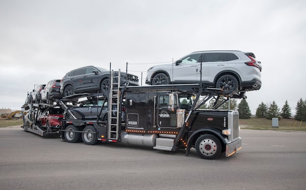 Honda CR-V and Civics on a trailer leave the manufacturing plant in Alliston, Ont., on April 15.Fred Lum/The Globe and Mail