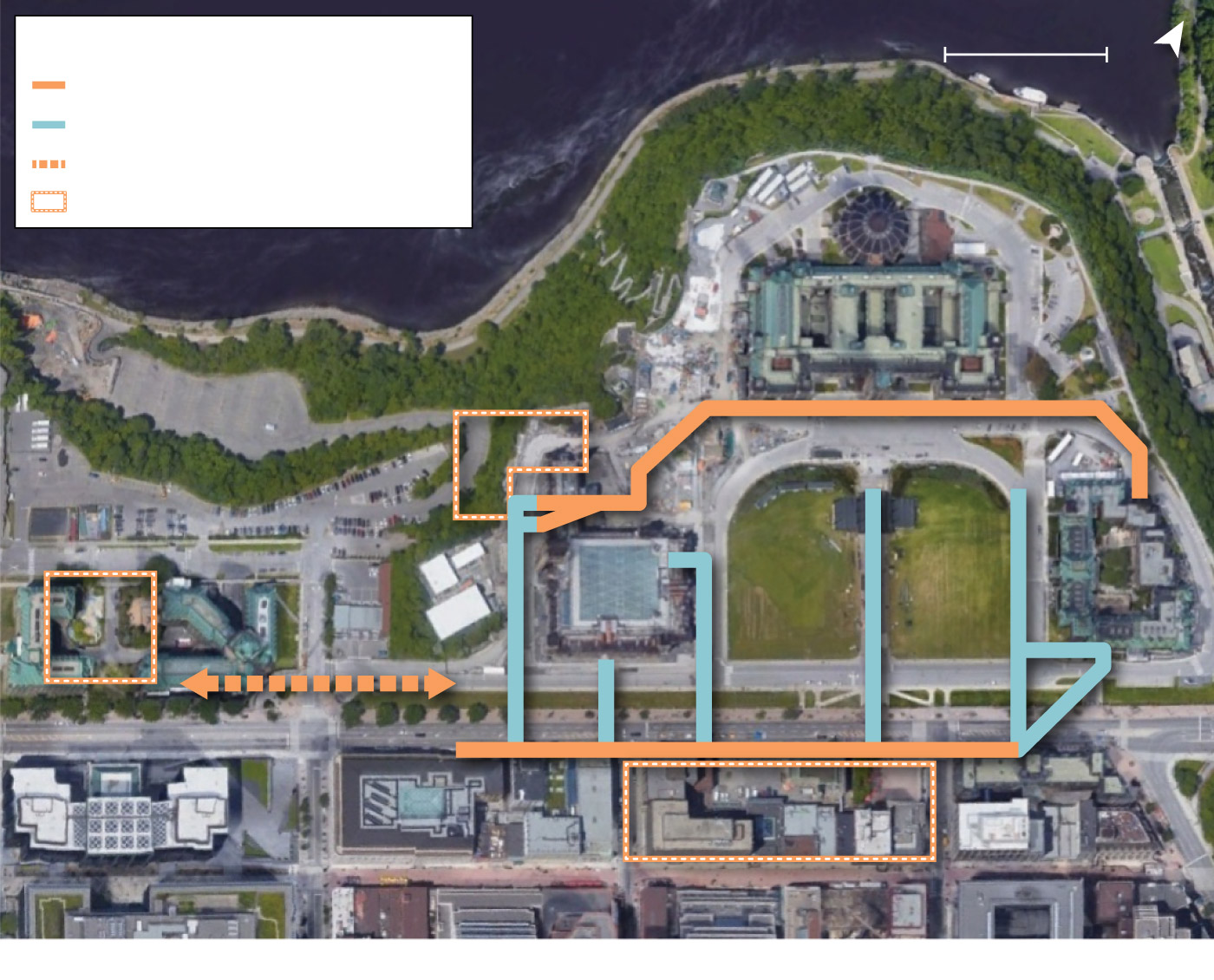 The tunnel loop would incorporate an existing short tunnel between the House of Commons visitor centre and the West Block. It may also incorporate parts of tunnels that once linked Centre Block with West and East blocks but were decommissioned because of the visitor centre construction.
