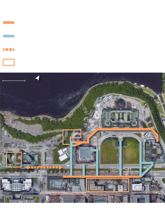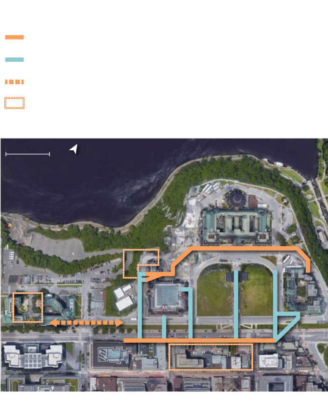 A second phase anticipates linking the Confederation Building, with its distinctive green roof, and the Justice Building, with its sandstone exterior, on Wellington Street.