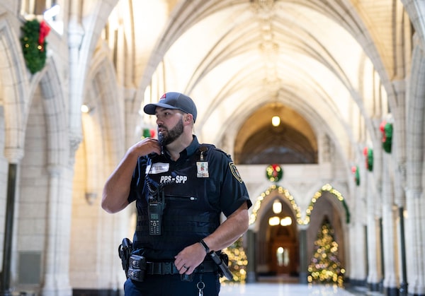 A Parliamentary Protective Service officer wears a ball cap as part of a labour protest as he works in Centre Block, on Parliament Hill, in Ottawa, on Dec. 18, 2018.Justin Tang