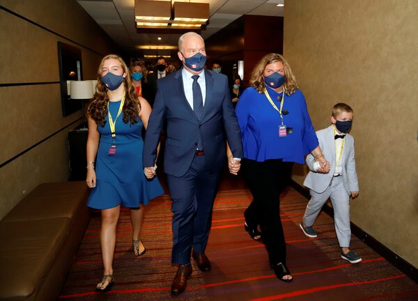 Erin O'Toole walks with his family, wife Rebecca, daughter Mollie, and son Jack, to give his victory speech as the new leader of Canada's main opposition Conservative Party in Ottawa on August 24, 2020.PATRICK DOYLE/Reuters