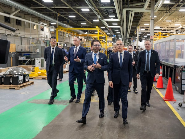 Prime Minister Mark Carney and CAE Inc. president and CEO Matthew Bromberg tour the company's facilities in Montreal on Tuesday.Christinne Muschi/The Canadian Press