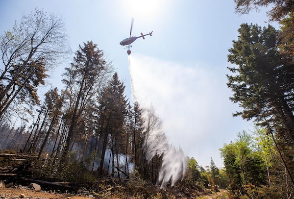 This image, courtesy of the Nova Scotia Government, shows a helicopter dropping water on a hotspot behind Yankeetown Road as excavator makes a fire break in the Tantallon wildfire on June 1, 2023.Supplied/AFP/Getty Images