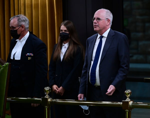 President of the Public Health Agency of Canada Iain Stewart, right, approaches the bar in the House of Commons to be admonished by the Speaker of the House of Commons Anthony Rota on Parliament Hill in Ottawa on June 21, 2021.Sean Kilpatrick/The Canadian Press