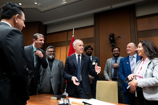 Prime Minister Mark Carney, centre, speaks with members of the Nepean riding following a swearing-in ceremony on Parliament Hill, in Ottawa, on May 22.Spencer Colby/The Canadian Press