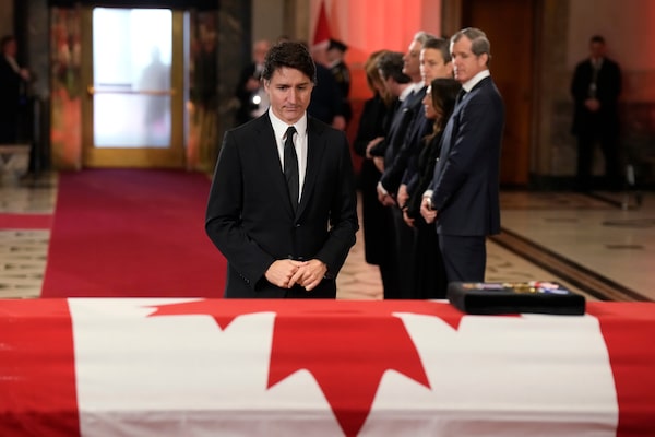 Prime Minister Justin Trudeau pays his respects at the casket former prime minister Brian Mulroney in Ottawa.Adrian Wyld/The Canadian Press