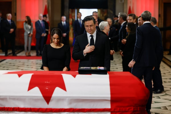 Conservative Leader Pierre Poilievre and his wife Anaida Poilievre pay their respects as former prime minister Brian Mulroney lies in state.Blair Gable/The Canadian Press