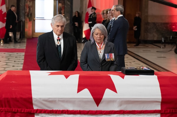 Governor-General Mary Simon and her husband Whit Fraser pay their respects at the casket of former prime minster Brian Mulroney as he lies in state.Adrian Wyld/The Canadian Press