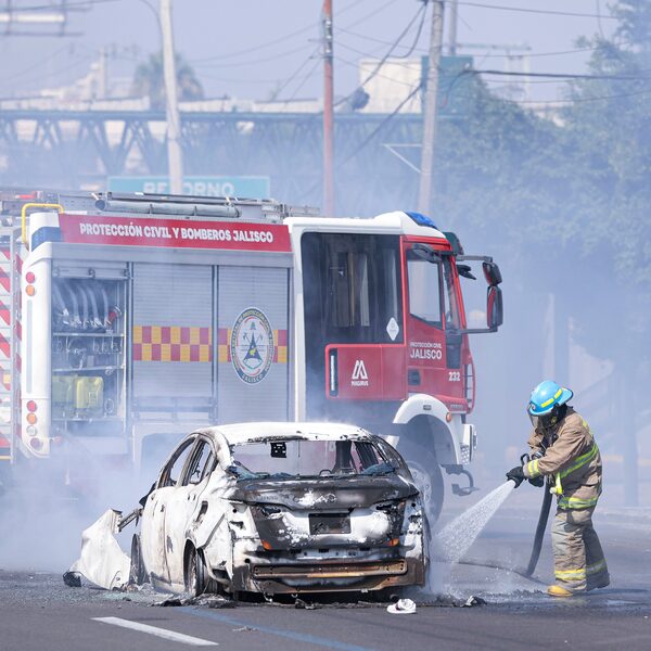 A firefighter extinguishes a car on fire on Sunday in Guadalajara, Mexico.Getty Images/Getty Images