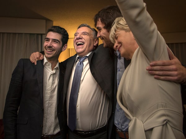 François Legault celebrates the results with his wife Isabelle Brais and sons Victor (L) and Xavier of the elections with his family in Quebec city.Roger Lemoyne/The Globe and Mail