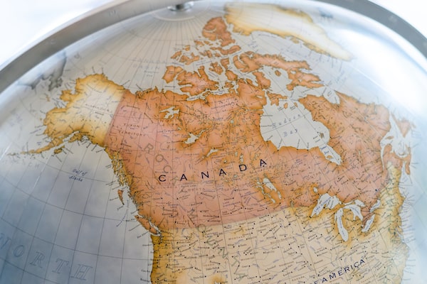 The globe differentiates Canada from the U.S. by showing the country in deep 'imperial' pink.
