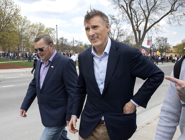 People's Party of Canada Leader Maxime Bernier, right, leaves a protest against government measures to curb the spread of COVID-19 in Peterborough, Ont., on April 24, 2021. Mr. Bernier is a former Conservative MP and cabinet minister who finished a close second to Andrew Scheer in the Conservative Party’s 2017 leadership race.Fred Thornhill/The Canadian Press
