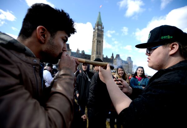 A man shares a large joint during this year's 4/20 marijuana celebration on Parliament Hill.Justin Tang/The Canadian Press