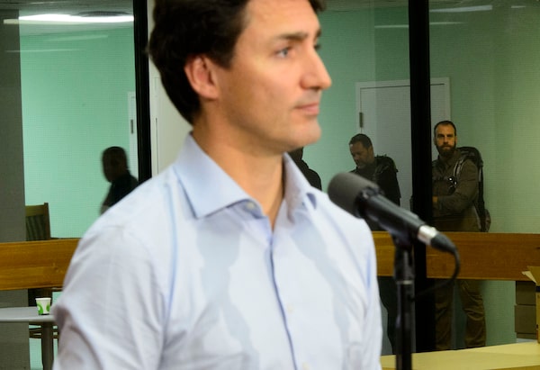 RCMP in tactical gear look on as Liberal Leader Justin Trudeau speaks at a Thanksgiving food drive in Toronto on Sunday, Oct. 13, 2019.Sean Kilpatrick/The Canadian Press