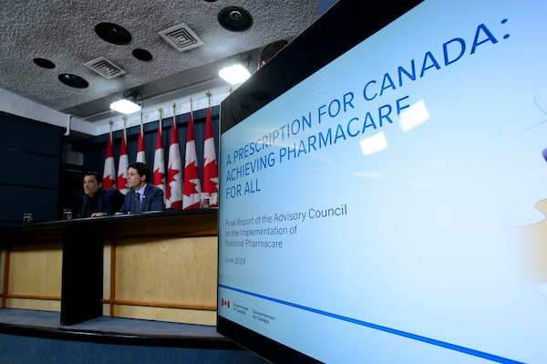 Dr. Eric Hoskins, chair of the Advisory Council on the Implementation of National Pharmacare, is accompanied by Vincent Dumez, member of the Advisory Council on the Implementation of National Pharmacare, during a press conference at the National Press Theatre in Ottawa on June 12, 2019.Sean Kilpatrick/The Canadian Press