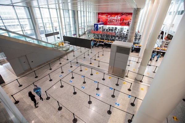 Health care workers prepare to test passengers before they arrive at Toronto's Pearson Airport on Feb.15.CARLOS OSORIO/Reuters