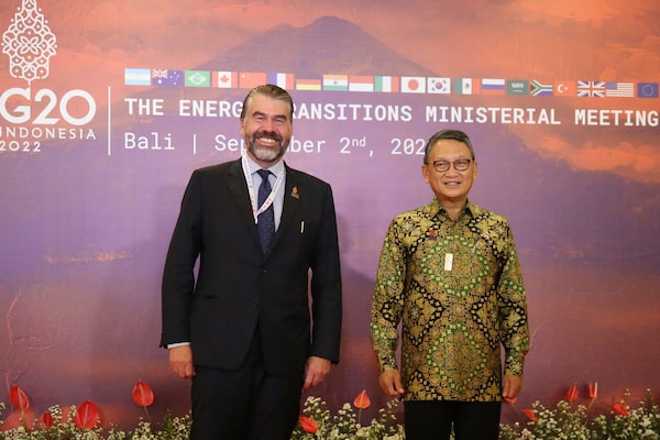 John Hannaford, left, then deputy minister of natural resources, with Indonesian energy and mineral resources minister Arifin Tasrif at the G20 Energy Transitions Ministerial meeting in Nusa Dua, Bali, Indonesia on Sept. 2, 2022.Firdia Lisnawati/The Canadian Press