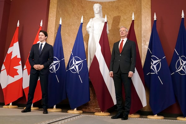 After stops in Poland and Estonia last week, Mr. Stoltenberg was in Latvia Tuesday alongside Mr. Trudeau and Latvian Prime Minister Krisjanis Karins and Spanish Prime Minister Pedro Sanchez.