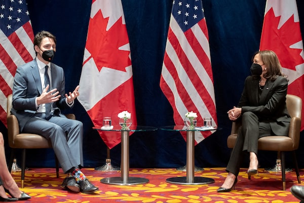 Prime Minister Justin Trudeau and U.S. Vice President Kamala Harris hold a meeting in Warsaw, Poland, on March 10.POOL/Reuters