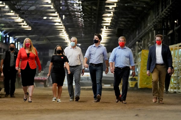 Liberal Leader Justin Trudeau, Chrystia Freeland and local candidates tour the factory at Valbruna ASW Inc. during Trudeau's election campaign tour in Welland, Ontario, on Sept. 6.CARLOS OSORIO/Reuters