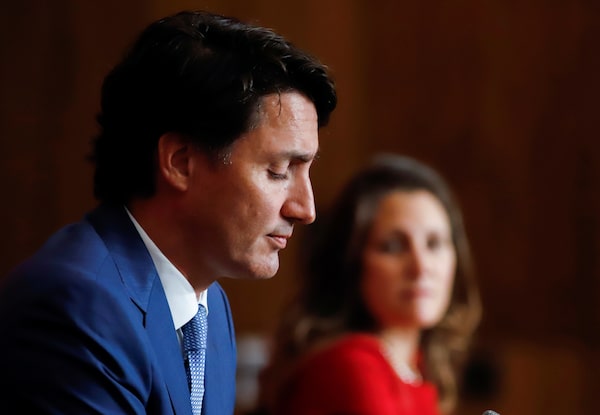 Prime Minister Justin Trudeau and Deputy Prime Minister Chrystia Freeland at a news conference in Ottawa on Oct. 6. Mr. Trudeau’s remarks Wednesday follow a decision by the Prime Minister to contact Tk’emlúps te Secwépemc Kukpi7 (Chief) Rosanne Casimir on Saturday to apologize.PATRICK DOYLE/Reuters
