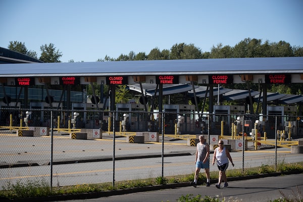 The Canada Border Services Agency inspection station at the Douglas-Peace Arch Canada-U.S. border crossing as people walk on the Canadian side of the border in Surrey, B.C., on May 13, 2021.DARRYL DYCK/The Globe and Mail