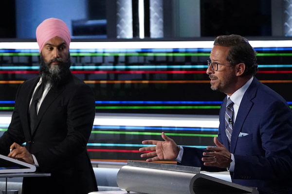 New Democratic Party Leader Jagmeet Singh looks on as Bloc Quebecois leader Yves-Francois Blanchet speaks during the federal election French-language leaders' debate at the Canadian Museum of History in Gatineau, Que.SEAN KILPATRICK/AFP/Getty Images