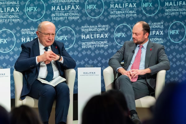 Andrius Kubilius, the European Commissioner for Defence and Space, left, and moderator Vladimir Kara-Murza take part in the Halifax International Security Forum on Saturday.Kelly Clark/The Canadian Press