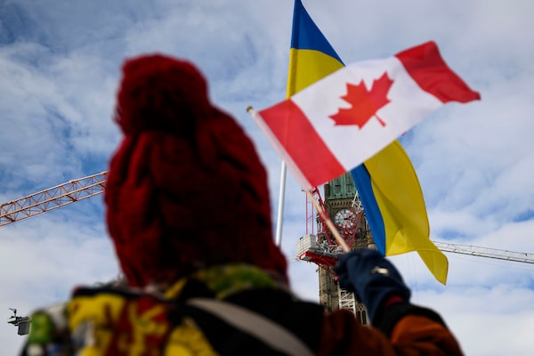 People wave the Canadian and Ukrainian flags as they rally on Parliament Hill to mark the 3rd anniversary of Russia's full-scale invasion of Ukraine, in Ottawa on Feb. 23.Justin Tang/The Canadian Press